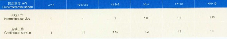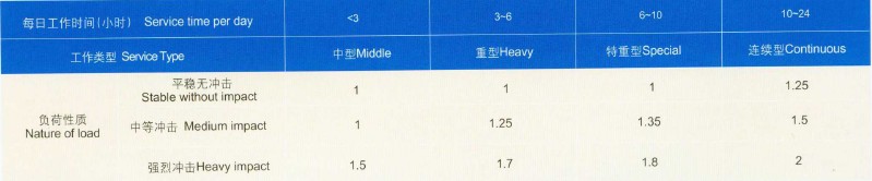 a.減速器入軸功率為電機(jī)功率的0.94—1.4倍時,即按單級選用方法計(jì)算后,K1。K2之乘積小于1.4者,可以電機(jī)全容量選用。以”○”表示,并定名為基本規(guī)格。常用于平穩(wěn)連續(xù)或輕度;中擊的工作負(fù)荷。