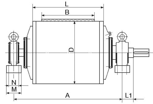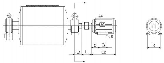 外置式電動(dòng)滾筒是將電動(dòng)機(jī)裝在滾筒體的外面、減速機(jī)構(gòu)裝在滾筒體內(nèi)部的一種新型電動(dòng)驅(qū)動(dòng)裝置。它不但具有原電動(dòng)滾筒的所有優(yōu)點(diǎn),而且克服了電動(dòng)機(jī)散熱條件差、容易燒損、使用功率受剜限制的弱點(diǎn),其功率可達(dá)160kW甚至更大。