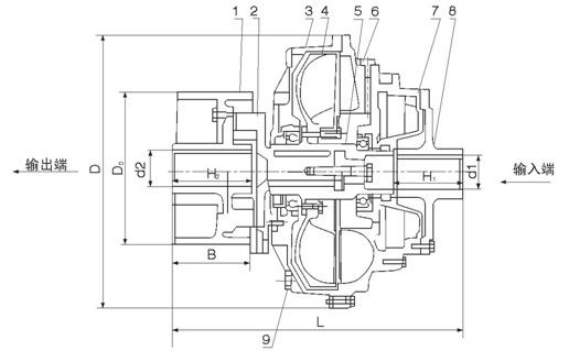 1制動(dòng)輪,2連接軸,3外殼,4渦輪,5主軸,6泵輪,7后輔腔,8連接盤(pán),9易熔塞